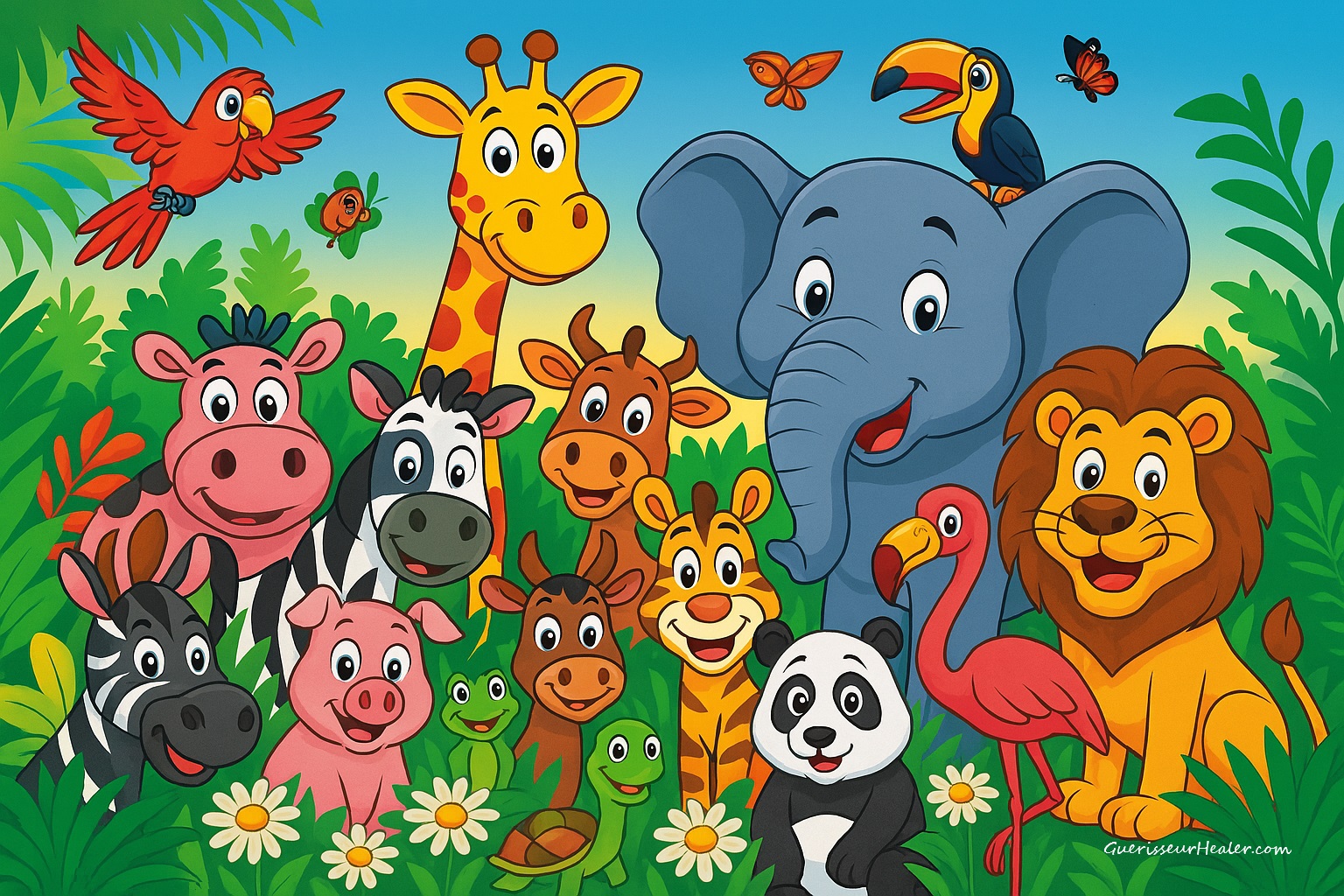 Une joyeuse harmonie du vivant : des animaux réunis dans un monde coloré, paisible et ludique, reflet d’une conscience partagée et d’une éthique implicite entre les espèces? Inspiré d’un style de poster édité par For Wall (Pologne).